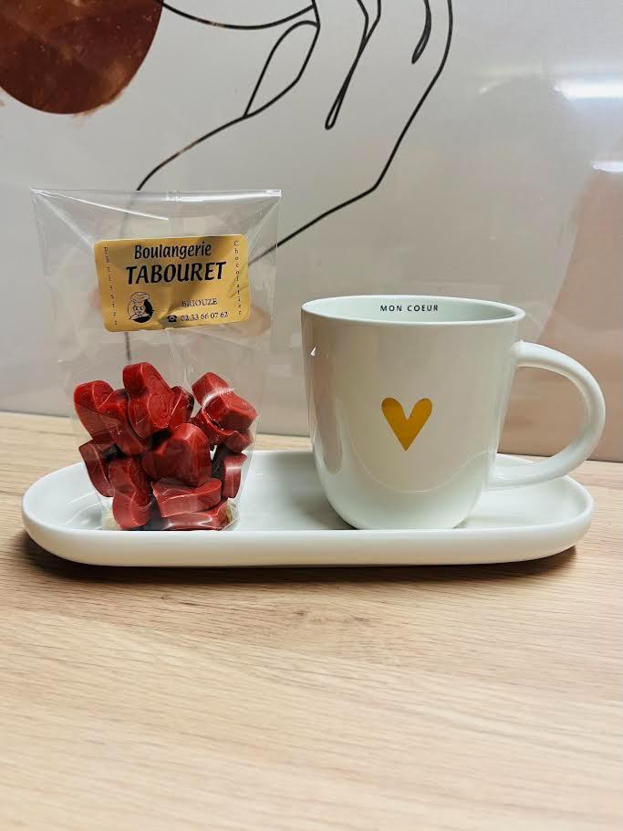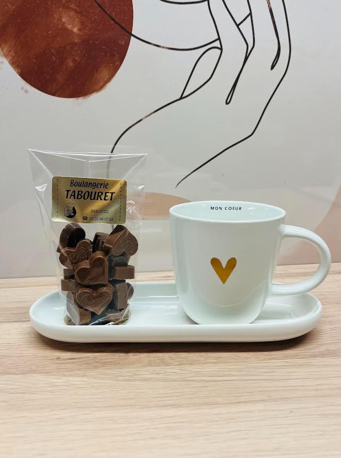 Coffret Saint- Valentin - Chocolat + Mug Mon Cœur + Plat Ovale Blanc