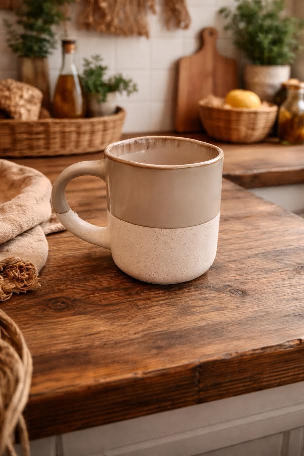 Apportez une touche d’authenticité et de douceur à vos pauses café avec cette tasse à café en faïence bicolore au charme naturel. Son beige foncé chaleureux, subtilement contrasté par un liseré brun délicat, évoque l’artisanat et les matières brutes. Chaque tasse semble raconter une histoire, avec de légères variations de teinte qui rendent chaque pièce unique.